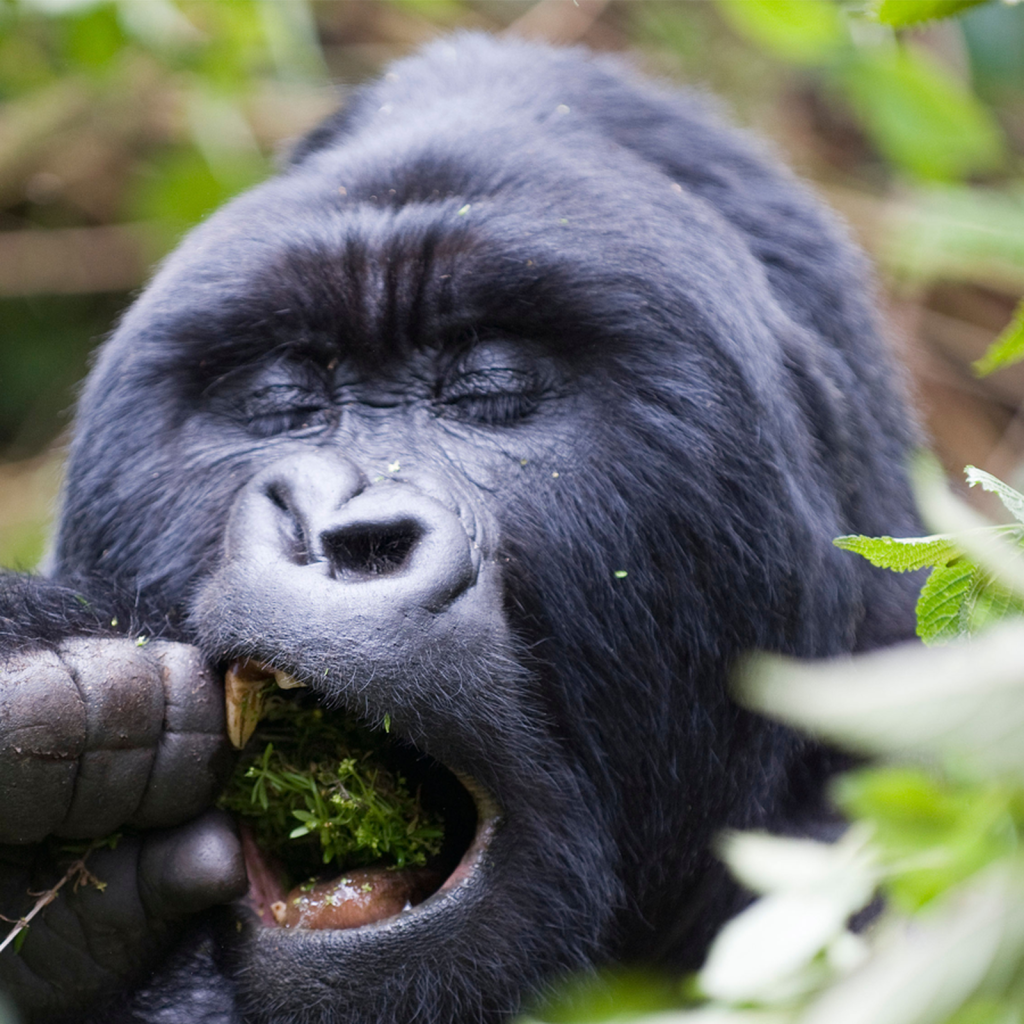 In the misty highlands, mountain gorillas hunker down with an all-you-can-chew buffet of leaves—think wild celery stalks, thistle heads, nettle shoots and into the lowland jungle and the will be seen eating figs, guavas, and other sugar-packed fruits top the bill… at least until the dry months hit.